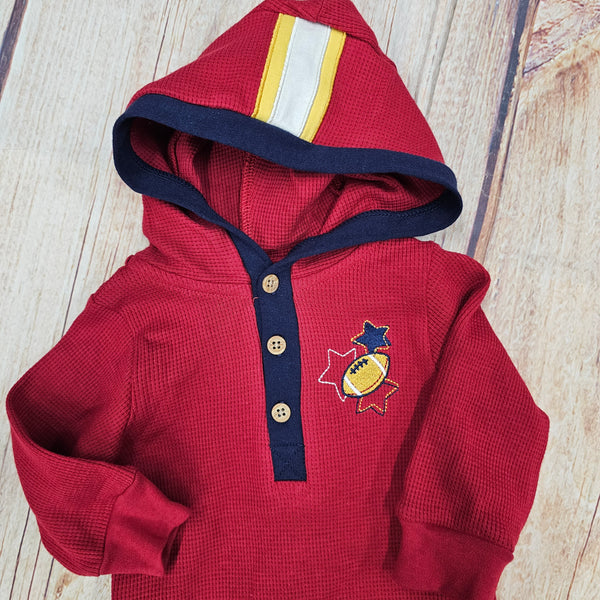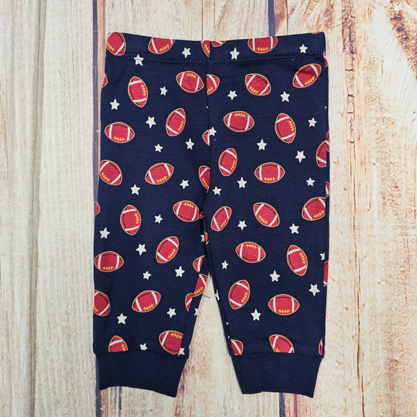 PANTS ARE BLUE WITH BURGANDY FOOTBALLS